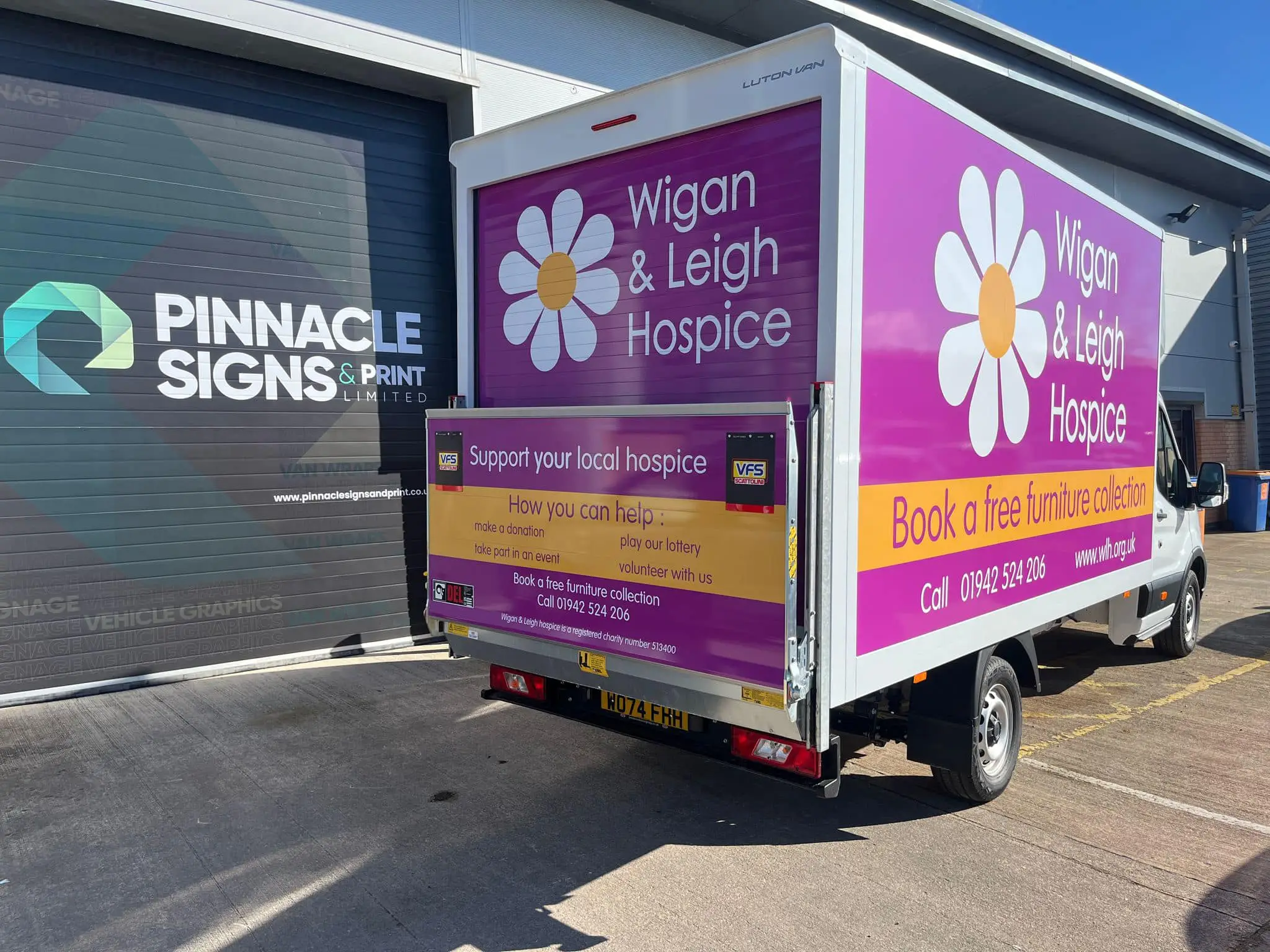 Another standout project rolled out of the workshop – this time for the brilliant team at Wigan & Leigh Hospice. We had the pleasure of applying a full printed wrap to their brand-new Luton box van, recently supplied by Westwood Motor Group.